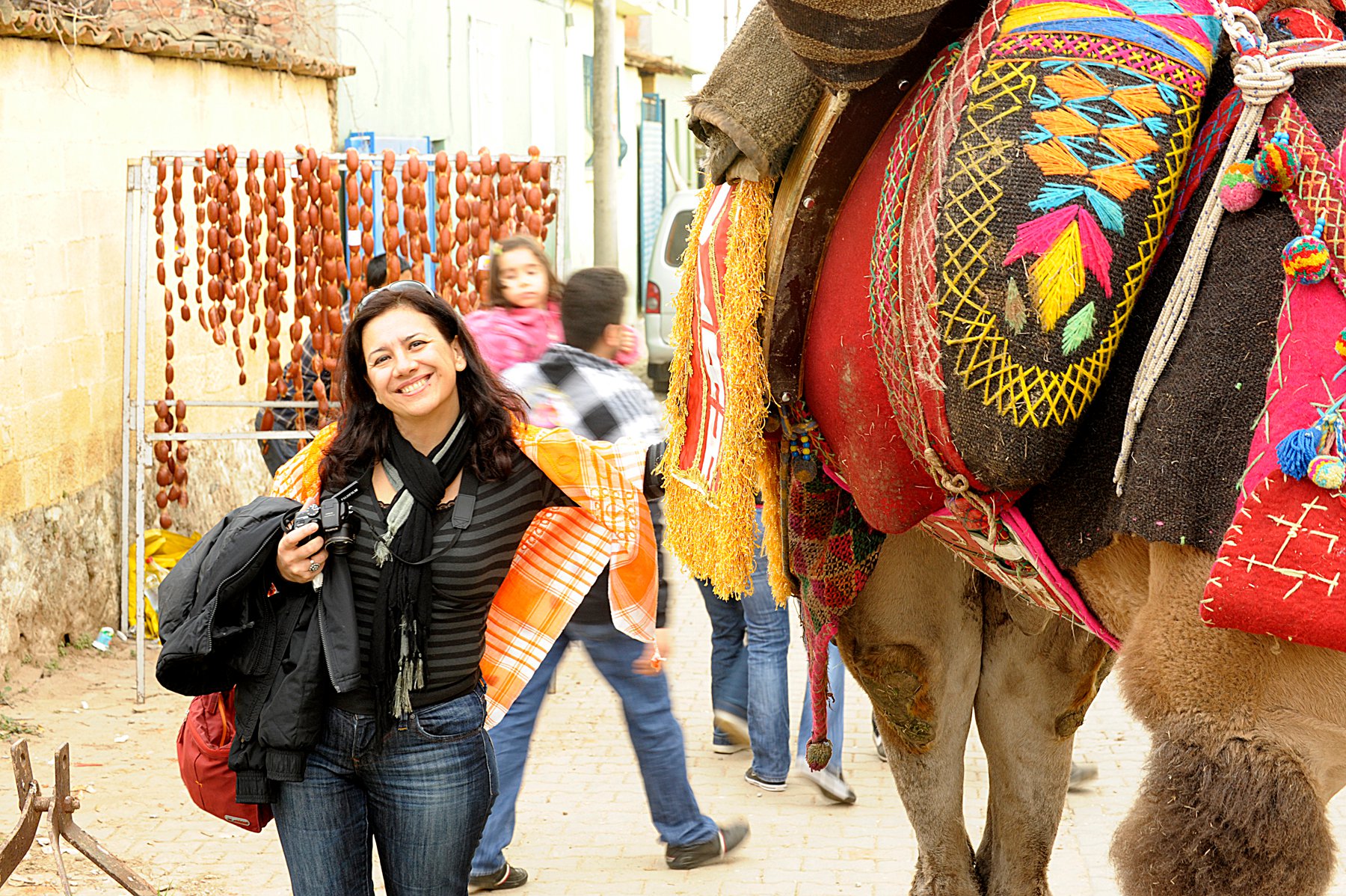 Aydın Deveciler Derneği lokalinin önünde aracımızdan inerken, develer de davul zurna eşliğinde meydana geliyorlar. Her yeni gelen, kısa bir süre durup, kendini göstererek, güreşin yapılacağı alana doğru yürümeye başlıyor. Üzerlerindeki çan ve zillerin çıkardığı ritmik seslerle zeybek havalarına eşlik ederken podyumda yürüyen manken gibiler. Süslemeler öyle canlı, öyle göz alıcıydı ki… Semerlerinin arkasında isimleri işli, dokuma, üçgen arkalıkların yanlarından büyüklü küçüklü, rengarenk boncuklar, deniz kabukları ve aynalarla işlenmiş parçalar, yünden yapılmış ponponlar, çanlar sarkıyor. Daha da süslü olan baş kısımlarında yanaklarına takılmış ziller ile gelin telinden tutun da allı, morlu, altın, gümüş sırma işli şifon eşarplara kadar geleneksel gelin başında ne varsa hepsi kullanılmış. Bacaklarına da boncuklu halhallar takmayı ihmal etmemişler. Türk bayrağı ile maşallah yazısı tümünde var. Güzel olduklarının öylesine farkındalar ki, edalı edalı güreş alanına doğru giderlerken biz de arkalarından yürüyoruz.