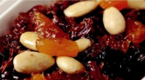 Yumuşamaları için akşamdan suya koyduğu kuru kayısı ve eriği kontrol eder, bademlerin kabuklarını soyar, bir tavada tahta kaşık ile yavaş yavaş kavurur, pembeleşmeye başlayınca günler öncesinden kalaylattığı küçük bakır sahanlardan birine döküp, bu defa çam fıstıklarına aynı işlemi uygulardı. Daha sonra ocağın üstündeki tencerenin kapağını açıp, etin üzerinde birikmiş köpükleri kaşıkla alır, suyu eksildiyse biraz daha et suyu ilave eder, çıkan bulaşıkları yıkadıktan sonra da önce erikleri, arkasından kayısıları, tarçın ve karanfilleri de atar ve yavaşça karıştırmaya başlardı.